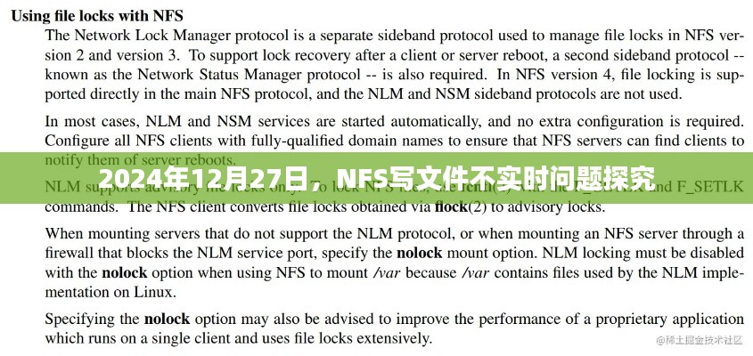 随着信息技术的不断发展,网络文件系统(NFS)作为分布式存储的重要组成部分,被广泛应用于各种场景,在NFS的使用过程中,有时会出现写文件不实时的问题,即文件写入操作不能立即反映出来,造成数据同步延迟,本文将对这一现象进行深入探讨,并尝试提供解决方案。