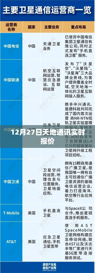 随着科技的飞速发展和全球化的推进,信息通讯行业日新月异,天地通讯作为业内的佼佼者,其报价动态备受关注,本文将为您带来12月27日天地通讯的实时报价及相关市场分析。