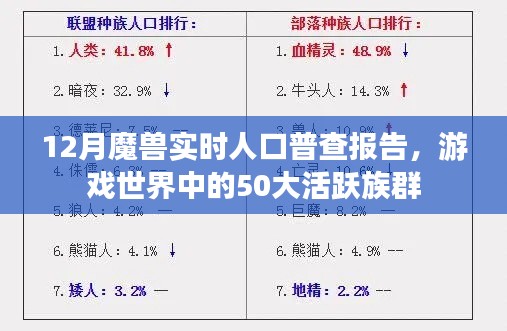 随着冬季的脚步日渐临近,魔兽世界中的氛围愈发浓厚,在这个充满奇幻与冒险的世界里,玩家们的热情不减反增,正值年末之际,我们对魔兽世界进行了一次实时人口普查,旨在揭示当前游戏世界中最为活跃的50大族群,以下是详细的人口普查报告。