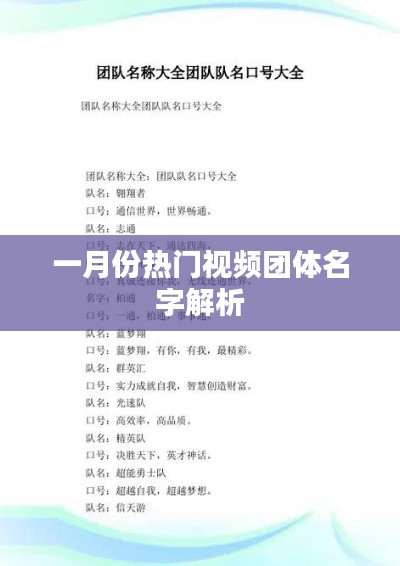 就是一月份热门视频团体的名字及其背后的故事,这些视频团体凭借创新的内容、独特的风格和精彩的演绎赢得了广大网友的喜爱,他们的名字也体现了各自的团队文化和团队理念,为观众带来了欢乐和感动。