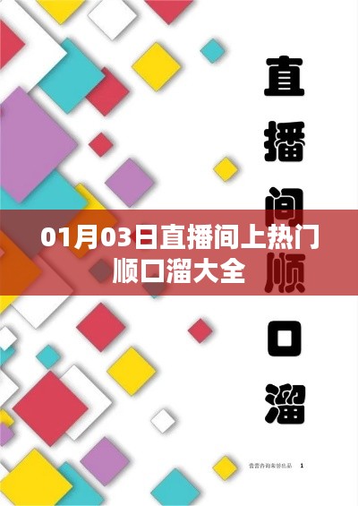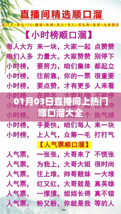 随着互联网的普及和直播行业的火热发展,越来越多的人加入到直播的行列中,希望通过直播间吸引更多的观众,在直播间中,一些有趣、顺口的顺口溜往往能够引起观众的关注和喜爱,本文将为你带来《01月03日直播间上热门顺口溜大全》,助你轻松吸引观众,提升直播间的热度。