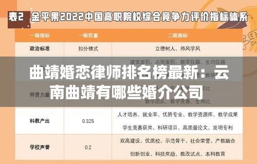 曲靖,作为云南省的一个重要城市,近年来婚恋市场日益活跃,随之而来的是婚姻法律问题的增多。为了更好地服务于这一群体,曲靖市的婚恋律师行业逐渐壮大,各类专业律师事务所如雨后春笋般涌现。本文将为您揭晓曲靖婚恋律师排名榜的最新情况。