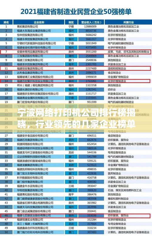 随着信息技术的快速发展,网络打印机已成为许多企业和个人日常办公不可或缺的一部分,宁波,作为中国的经济重镇,其网络打印机市场亦相当活跃,本文将为您详细介绍宁波网络打印机公司的排名及相关信息。