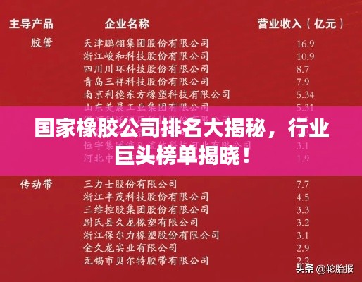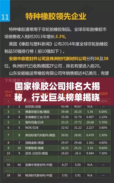 橡胶行业是国民经济的重要支柱产业之一,随着经济的发展,橡胶市场需求不断增长,在这个行业中,一些橡胶公司凭借自身的实力、技术和服务,逐渐崭露头角,成为行业的佼佼者,本文将介绍国家橡胶公司排名,带您了解这些行业巨头。