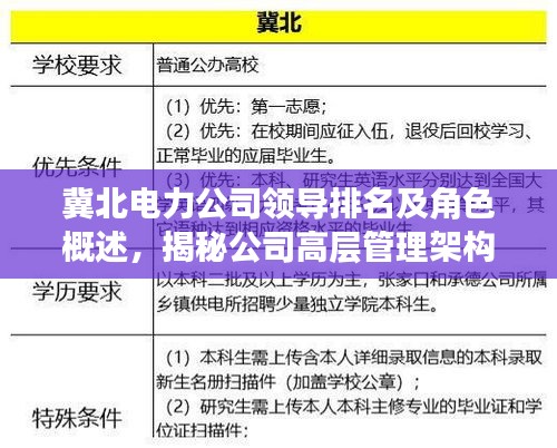 冀北电力公司,作为电力行业的领军企业,其领导团队的构成和排名备受关注,本文旨在介绍冀北电力公司的领导排名及其相关背景信息,为读者提供全面的了解。