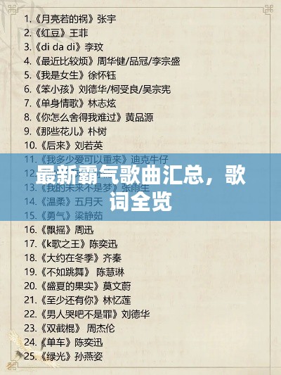 在当今音乐界,霸气歌曲以其独特的魅力和激昂的节奏赢得了众多听众的喜爱,这些歌曲不仅旋律激昂,歌词更是富有力量,鼓舞人心,以下是最新款霸气歌曲大全及其歌词的概述。