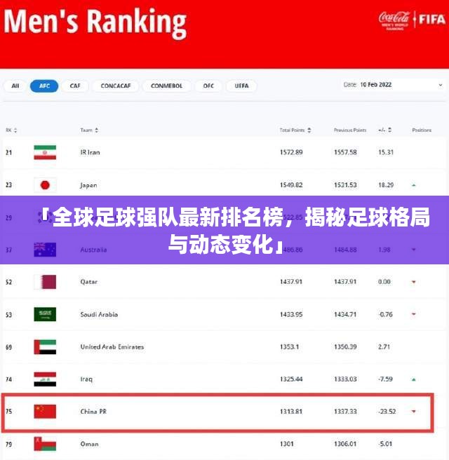 世界最新足联排名榜反映了全球足球强队的格局与动态,各队都在不断进取,努力提高实力,全球足球格局将继续变化,更多球队将崭露头角,让我们期待更多精彩的足球赛事,共同见证全球足球的发展。