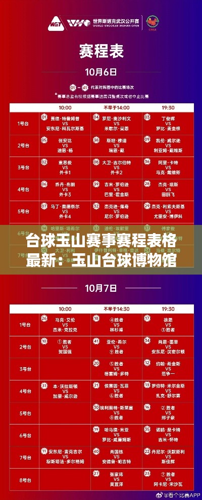 以下是台球玉山赛事的最新赛程表格,请各位参赛选手和观众留意以下时间节点: