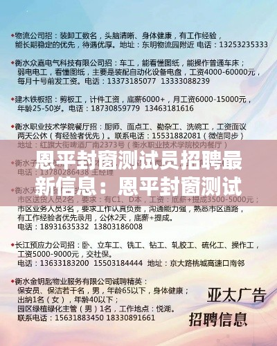恩平市某知名门窗制造企业,因业务拓展需要,现面向社会公开招聘封窗测试员。该公司致力于提供高品质的门窗产品,以满足国内外市场的需求。此次招聘旨在选拔一批具备专业素养和敬业精神的测试员,共同推动公司的发展。