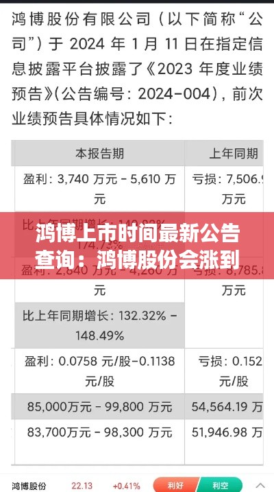 鸿博股份有限公司(以下简称“鸿博”或“公司”)是一家专注于提供金融、彩票、教育、文化等多元化服务的上市公司。公司股票于某年某月某日首次公开发行并上市,成为投资者关注的焦点。鸿博上市后,其股价走势、业绩表现等因素都受到市场的高度关注。为了方便投资者及时了解鸿博的最新动态,本文将对鸿博上市时间及相关公告进行梳理。