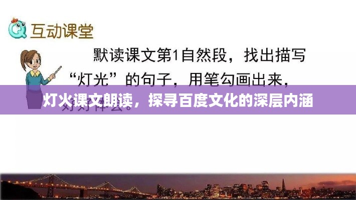 通过百度搜索灯火课文朗读,我们不仅能感受到课文的魅力,还能领略到百度文化的深度内涵,在这个信息爆炸的时代,让我们充分利用百度这个强大的工具,探索更多有趣的知识,感受文化的魅力。