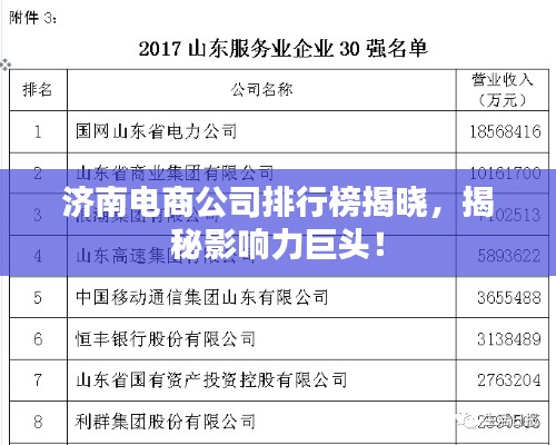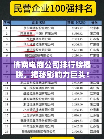 随着电子商务的飞速发展,济南作为山东省的省会城市,电子商务行业也取得了显著进步,众多电子商务公司如雨后春笋般涌现,为济南乃至整个山东省的电商生态注入了新的活力,本文将探讨济南电子商务公司的排名及其影响力。