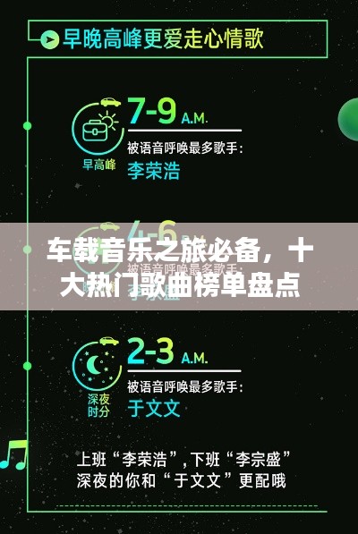 车载音乐是驾驶过程中的最佳伴侣之一,这些车载歌曲排名前十名的歌曲以其优美的旋律和深情的歌词赢得了广大车友的青睐,它们不仅能够带来愉悦和放松的感觉,还能激发人的精神力量和对生活的热爱之情,在漫长的驾驶旅程中,选择一首好的车载歌曲作为陪伴会让旅程更加美好和难忘,让我们在音乐的世界里畅游驾驶之旅吧!