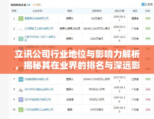 随着科技产业的飞速发展,众多优秀企业崭露头角,其中立讯公司凭借其卓越的表现和持续的创新力在众多企业中脱颖而出,本文将围绕立讯公司的排名及其在行业中的影响力进行深入探讨。