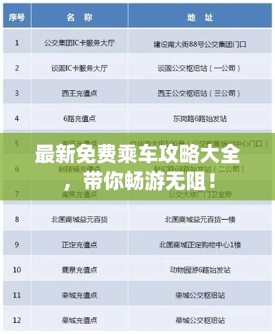 随着城市交通的日益发展,公共交通已成为人们出行的主要选择,对于经常需要乘坐公交或地铁的朋友来说,如何获取最新的免费乘车攻略,既省钱又便捷,无疑是一大关注点,本文将为你提供最新的免费乘车攻略大全,助你轻松出行。