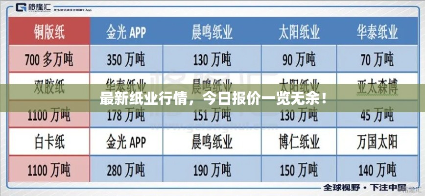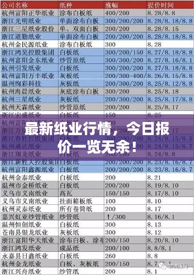 随着全球经济的不断发展和进步,纸业市场的动态变化也备受关注,纸业产品的价格不仅受到原材料供应的影响,还受到市场需求、国际贸易政策、汇率变动等多种因素的影响,及时获取纸业今日报价最新消息对于企业和个人来说都是至关重要的,本文将为您提供最新的纸业市场报价及相关消息。