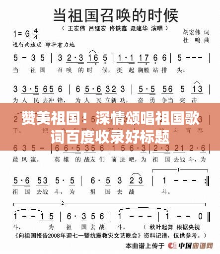 “百度一下祖国歌词”,我们能够感受到无数赞美祖国的深情赞歌,这些歌词赞美了祖国的美丽、繁荣、温暖、以及我们对祖国的热爱与忠诚,让我们共同为祖国的繁荣昌盛而努力,为实现中华民族伟大复兴的中国梦而奋斗!