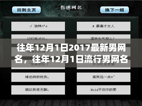 随着社会的快速发展和文化的多元化,男性在社交媒体上的自我表达也日益丰富多样,流行男网名的更迭不仅仅是简单的文字游戏,更是时代变迁和个人追求的体现,以“往年12月1日”这个时间点为参照,当时的流行男网名往往反映了当时的社会热点、流行趋势以及年轻人的内心向往,那些带有励志、进取色彩的网名反映了年轻人对未来的憧憬和对成功的渴望,一些独特的、富有创意的网名也是年轻人个性展示和自我标签的重要方式。