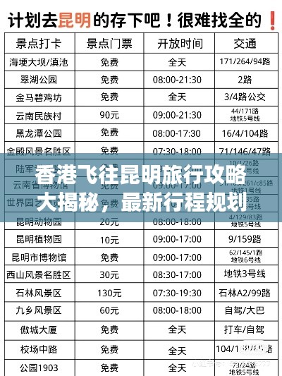 随着全球旅游业的蓬勃发展,越来越多的人选择从香港出发飞往昆明,感受这座美丽的春城,本文将为您提供一份详尽的香港飞往昆明旅行攻略,帮助您轻松规划行程,享受愉快的旅程。