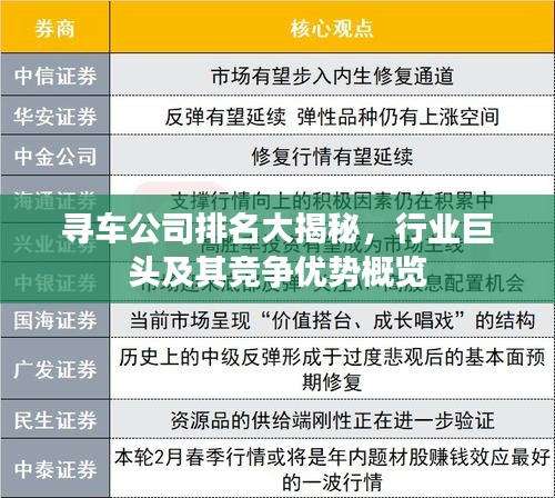 寻车公司作为汽车市场的重要组成部分,为消费者提供了便捷的寻车服务,在选择寻车公司时,消费者应根据自身需求和公司的综合实力、服务质量等因素进行综合考虑,寻车公司也应不断创新,提高服务质量,以应对市场的变化和满足消费者的需求,希望本文能够帮助您了解寻车公司的排名及其竞争优势,为您选择合适的寻车服务提供参考。