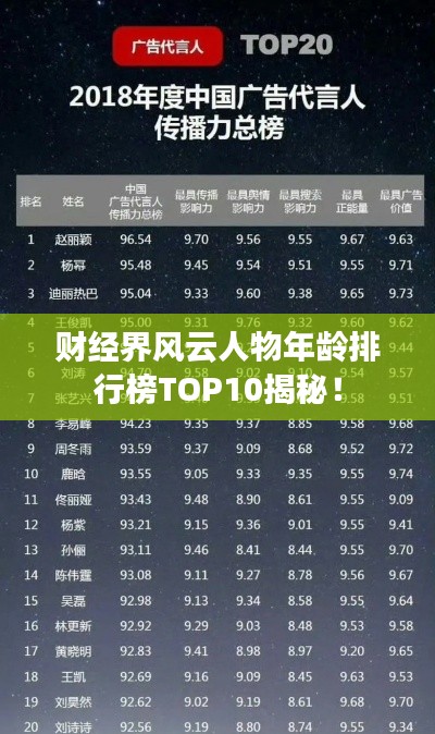 随着经济的发展,财经领域的人物逐渐受到广泛关注,他们的决策、眼光和勇气,在商海中每一次搏击,都牵动着市场的神经,本文将为您介绍财经人物年龄排名前十名,让我们一起了解他们的风采。