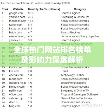 随着互联网的普及和技术的飞速发展,全球范围内的网站竞争日益激烈,本文将探讨世界热门网站的排名及其影响力,分析这些网站的成功因素,为读者揭示网络世界的格局。