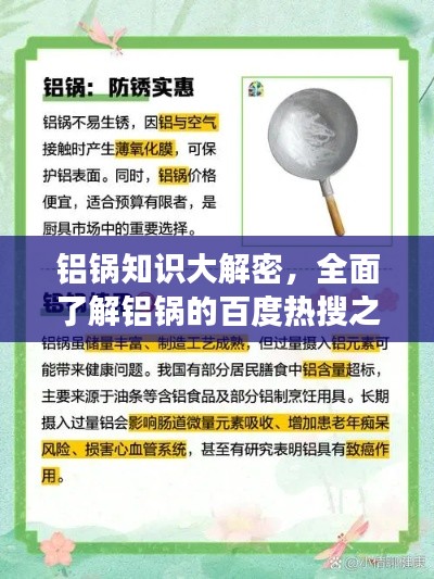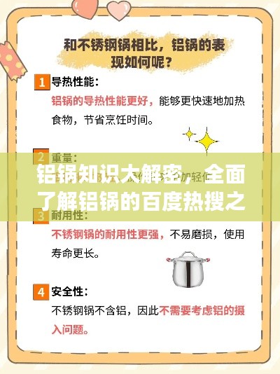 今天我们来探讨一下关于铝锅的种种知识,请跟我一起走进铝锅的世界,让我们共同揭开它的神秘面纱,我会从铝锅的定义、种类、特点、使用注意事项等方面进行详细的阐述,希望能够帮助大家更好地了解和使用铝锅。