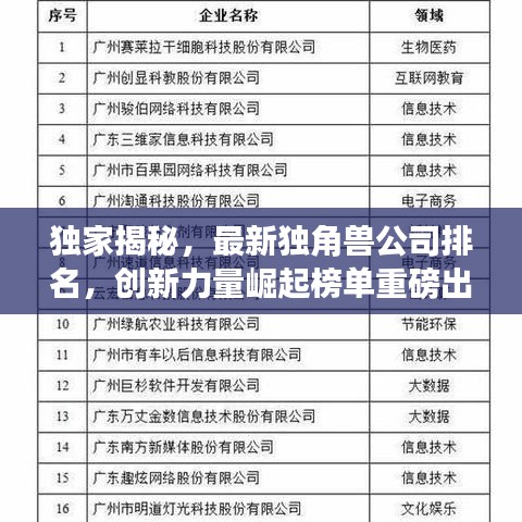 随着科技的飞速发展和创新精神的不断激发,独角兽公司作为一个新兴力量在全球范围内崭露头角,这些公司以其独特的商业模式、强大的创新能力和广阔的市场前景,吸引了全球投资者的关注,本文将为您带来最新的独角兽公司排名,揭示创新力量的崛起。