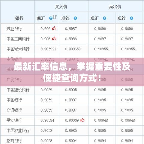 掌握最新汇率信息对于个人和企业来说具有重要意义,通过便捷的查询方式,如互联网查询、手机应用、电话查询和微信公众号等,用户可以轻松获取最新汇率信息,在进行今日汇率查询汇的最新查询时,需要注意准确性、实时性和多样性,希望本文能帮助您更好地了解今日汇率查询的相关知识,为您的金融活动提供有力支持。