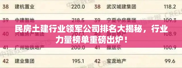 随着城市化进程的加速,民房土建行业迅速发展,众多土建公司如雨后春笋般崭露头角,本文将为您揭示民房土建行业的公司排名,带您了解行业领军者的风采和力量。