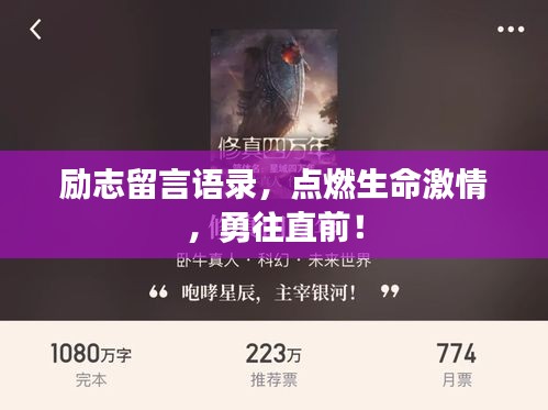 励志留言语录,是我们人生旅途中的一盏明灯,它照亮我们前行的道路,激励我们不断前行,让我们在信念、坚持、勇气、成长和奋斗中,迎接每一个挑战,把握每一个机遇,创造属于我们的辉煌人生,正如一句留言所说:“生命不息,奋斗不止,只要我们不断前行,就一定能够走向成功。”让我们共同铭记这些励志留言语录,燃烧生命,奋力前行!