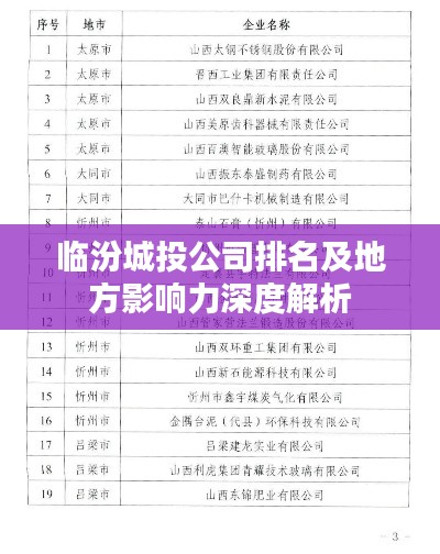 随着城市化进程的加快,城市投资公司的作用愈发重要,临汾城投公司作为推动当地城市建设与发展的关键力量,其排名及影响力日益引人关注,本文将深入探讨临汾城投公司的排名及其在当地的影响。
