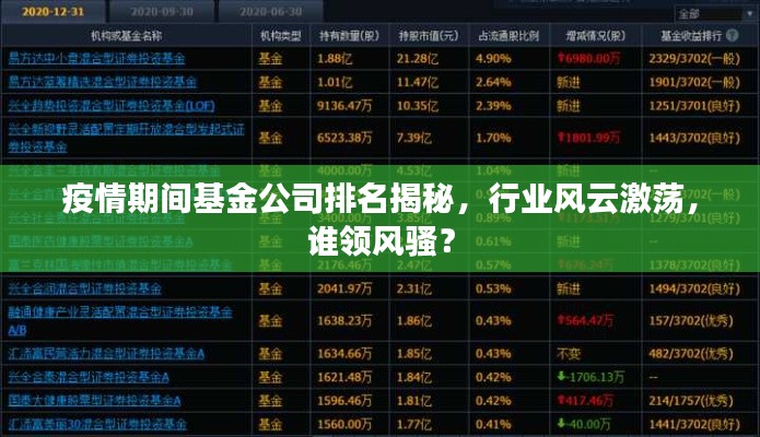 自新冠疫情爆发以来,全球经济受到巨大冲击,金融市场波动加剧,在这样的大背景下,基金公司的表现尤为引人注目,本文将围绕“疫情期间基金公司排名”这一主题,探讨疫情期间基金公司的表现及其排名情况,揭示行业风云变幻。