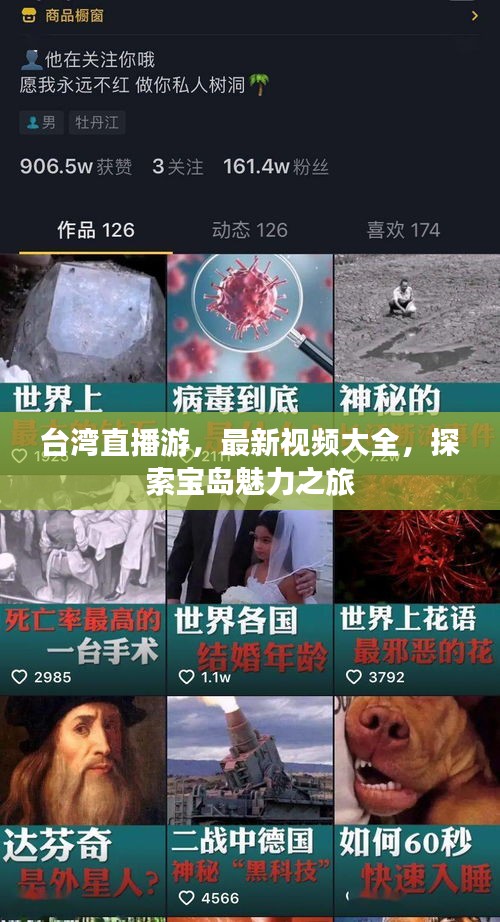 随着科技的进步和互联网的普及,越来越多的人选择通过直播视频了解世界各地的风景和文化,台湾,这个充满魅力的宝岛,以其独特的自然风光和丰富的文化吸引了无数游客的目光,本文将为您带来“游玩台湾直播视频大全最新”的相关内容,带您一起探索宝岛的魅力之旅。