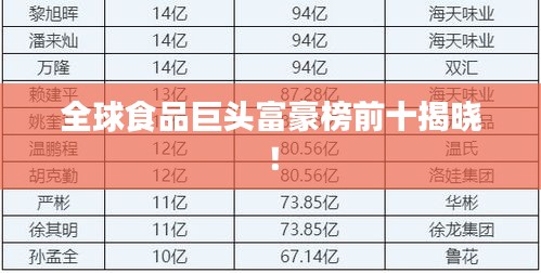 在全球化的背景下,这些食品富豪还积极拓展国际市场,通过并购、合作等方式扩大市场份额,提高竞争力,他们的企业不仅在本土市场取得了巨大的成功,还在全球范围内赢得了消费者的认可和喜爱。