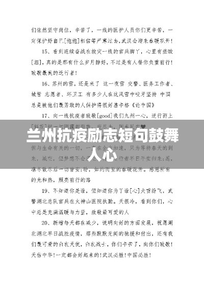 兰州,这座美丽的城市,在疫情的阴霾下依然坚韧不拔,在这场没有硝烟的战斗中,人们团结一心,共同抗击疫情,以下是关于兰州疫情的励志语录短句,让我们一起为兰州加油,为战胜疫情而努力!