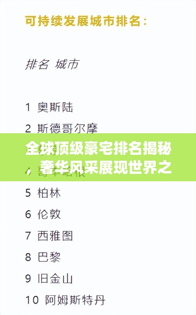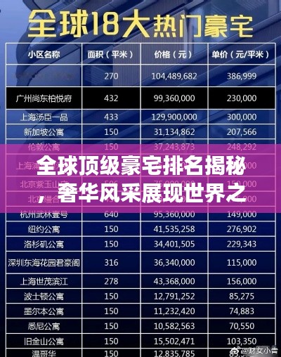 豪宅不仅仅是房屋的极致体现,更是财富、地位与品味的象征,本文将为您揭示全球极品豪宅的排名,带您领略那些令人叹为观止的奢华住宅的风采。