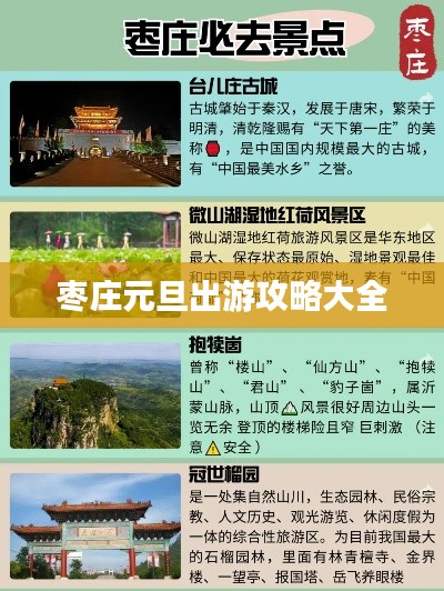 枣庄是一个充满魅力的城市,拥有丰富的自然和文化资源,元旦期间是探访这座城市的好时机,通过本攻略,希望你能更好地了解枣庄的元旦旅游信息,为你的旅行提供有益的参考,无论你是喜欢自然风光还是历史文化,都能在枣庄找到适合自己的旅游项目,祝你在枣庄度过一个愉快的元旦假期!