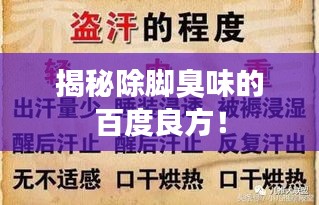 通过百度搜索,我们可以找到很多有效的除脚臭方法,预防脚臭的关键在于保持脚部清洁、干燥,使用抗菌产品,穿透气的鞋袜等,还可以尝试一些民间偏方,如果脚臭问题严重,建议及时寻求专业医生的帮助,希望本文的介绍对您有所帮助,让您远离脚臭困扰,在日常生活中,我们还要关注脚部健康,保持良好的生活习惯,从而远离脚部疾病的威胁。