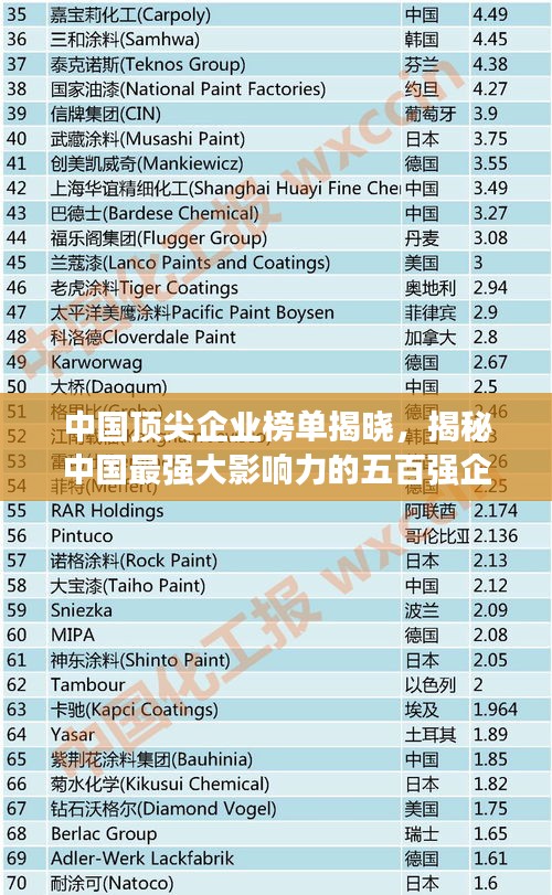 中国经济发展迅速,众多企业在国内外市场上崭露头角,本文将围绕“中国500公司排名”展开讨论,介绍中国最顶尖企业的力量与影响力,这些企业在推动中国经济增长、促进就业以及创新科技等方面发挥着重要作用。