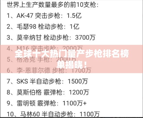 在当今世界,步枪作为重要的军事装备之一,其性能、精度和可靠性是衡量一个国家军事工业水平的重要指标之一,在各种型号的步枪中,量产步枪更是代表了国家的军事制造实力和战斗力,本文将介绍全球范围内量产步枪排名前十名,这些步枪在性能、精度、可靠性等方面都有着出色的表现。