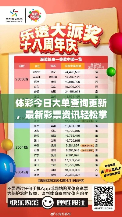在当今信息化社会,越来越多的人对彩票产生了浓厚的兴趣,随着体育彩票的普及,越来越多的人希望通过查询获取最新的彩票信息,本文将介绍如何轻松查询体彩今日大单最新信息,帮助彩民们把握机会,实现自己的梦想。