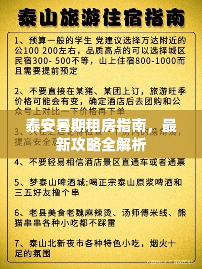 泰安作为一座历史悠久、文化底蕴深厚的城市,每年暑假都吸引着大量学生、游客和短期工作者前来,对于需要在泰安度过暑假的朋友们来说,租房成为了一个重要的问题,本文将为你提供一份最新的泰安暑假租房攻略,帮助你更好地了解租房市场,找到适合自己的房源。