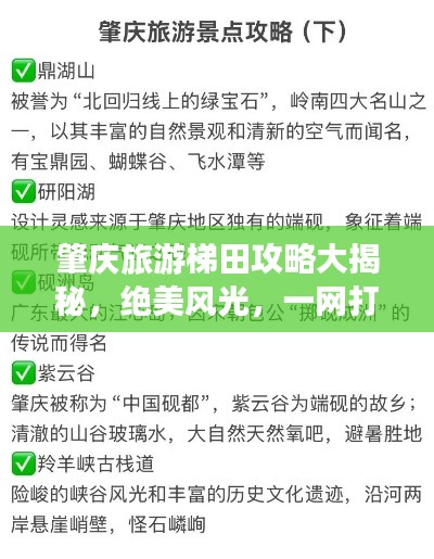 肇庆市位于中国广东省的珠江三角洲地区,是一个自然风光优美、人文底蕴深厚的城市,这里的旅游资源丰富多样,尤以梯田景观最为引人入胜,本文旨在为游客提供一份详尽的肇庆旅游梯田攻略,帮助大家更好地了解并欣赏这片美丽的土地。