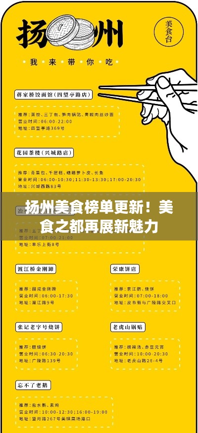 扬州,这座历史悠久的城市,以其独特的文化气息和美食文化而著称于世,我们将聚焦于扬州美食的最新动态,为您带来扬州美食打榜榜单的最新消息,您将领略到扬州美食的魅力,感受这座城市的独特韵味。