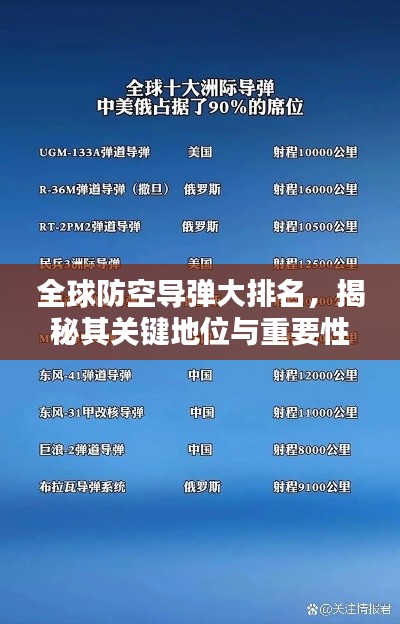 随着全球安全形势的不断变化,防空导弹在现代战争中的作用愈发凸显,各国都在竞相研发先进的防空导弹系统,以应对日益复杂的空中威胁,本文将探讨世界防空导弹的排名及其在全球安全格局中的重要性。