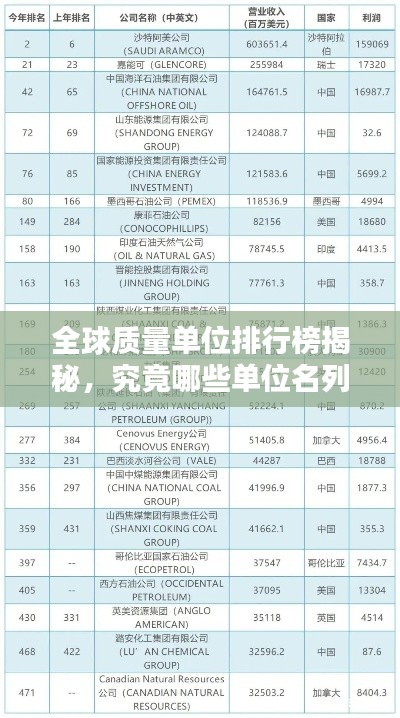 在全球质量和标准化领域,质量单位的选用与运用至关重要,不同的国家和地区,根据自身的需求和特点,采用着不同的质量单位,本文将探讨世界范围内的质量单位排名,以飨广大读者。