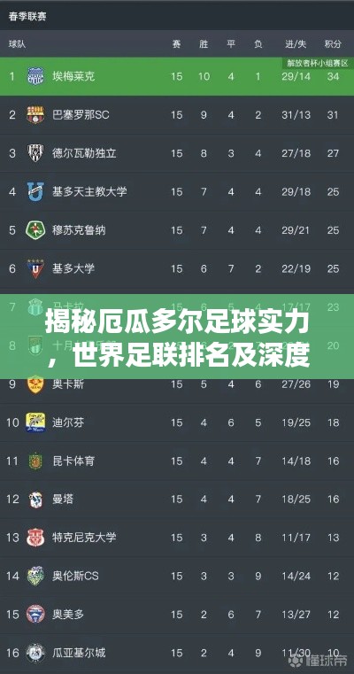 世界足联(FIFA)每年都会根据各国在国际比赛中的表现进行排名,这些排名反映了各国足球实力的差异,并决定了参加世界杯等国际赛事的种子队伍分配,厄瓜多尔作为南美洲的一支重要球队,其世界足联排名一直备受关注。