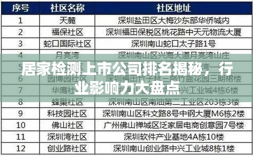 本文通过对居家检测上市公司的排名和行业影响力分析,展示了这些公司在市场上的竞争力和行业地位,随着居家检测市场的不断扩大,投资者和相关人士应关注这一领域的动态,以便把握市场机遇,居家检测上市公司也需要不断创新,提高技术水平,以满足消费者的需求,推动行业的持续发展。