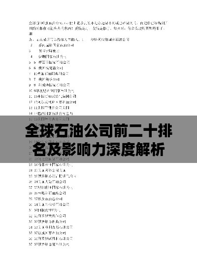 随着全球能源市场的不断变化,石油公司的排名也在不断变化之中,本文将介绍全球前20石油公司的排名及其影响力分析,以了解这些公司在全球石油市场的地位和发展趋势。
